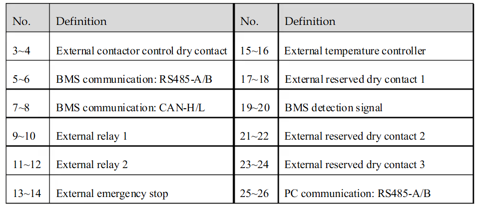 To establish communication between the PCS and Controller, use the RS485 interface available on the external wiring terminal bar, as shown below. This terminal provides dedicated ports for RS485 communication, which is used for both PC and BMS connections.